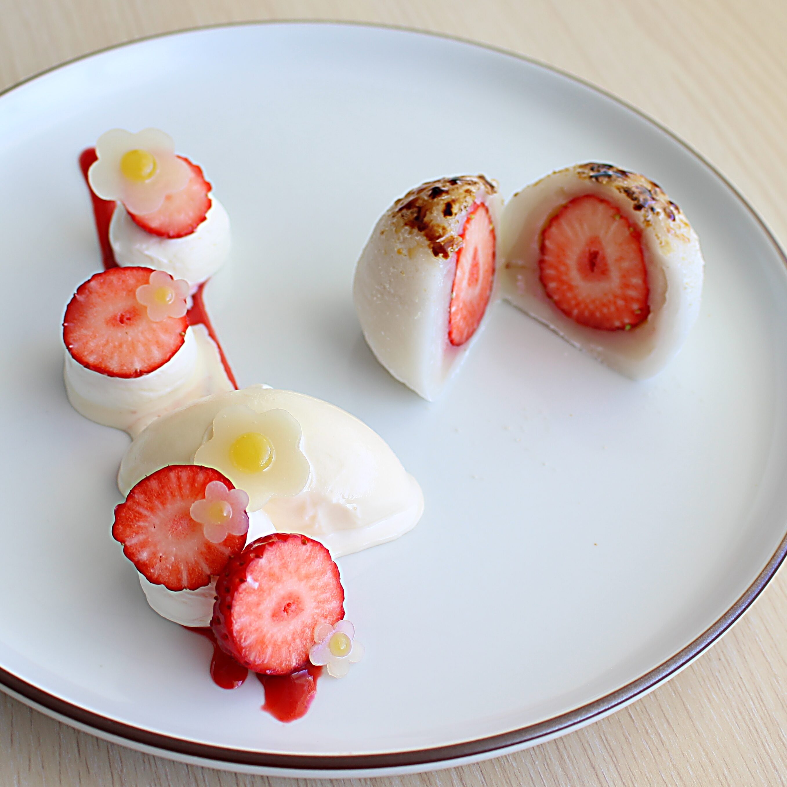 素材の香りや旨みを繊細に引き立てる元パティシエの和菓子職人が手がける、四季折々の恵みを用いた華やかで余韻の残る和アシェットデセール。やわらかな求肥で包んだみるく餡と甘みと香りの強い「とちおとめ」を合わせました。粉糖と和三盆を香ばしく仕上げ、パリッとした表面となめらかな口どけが楽しめます。