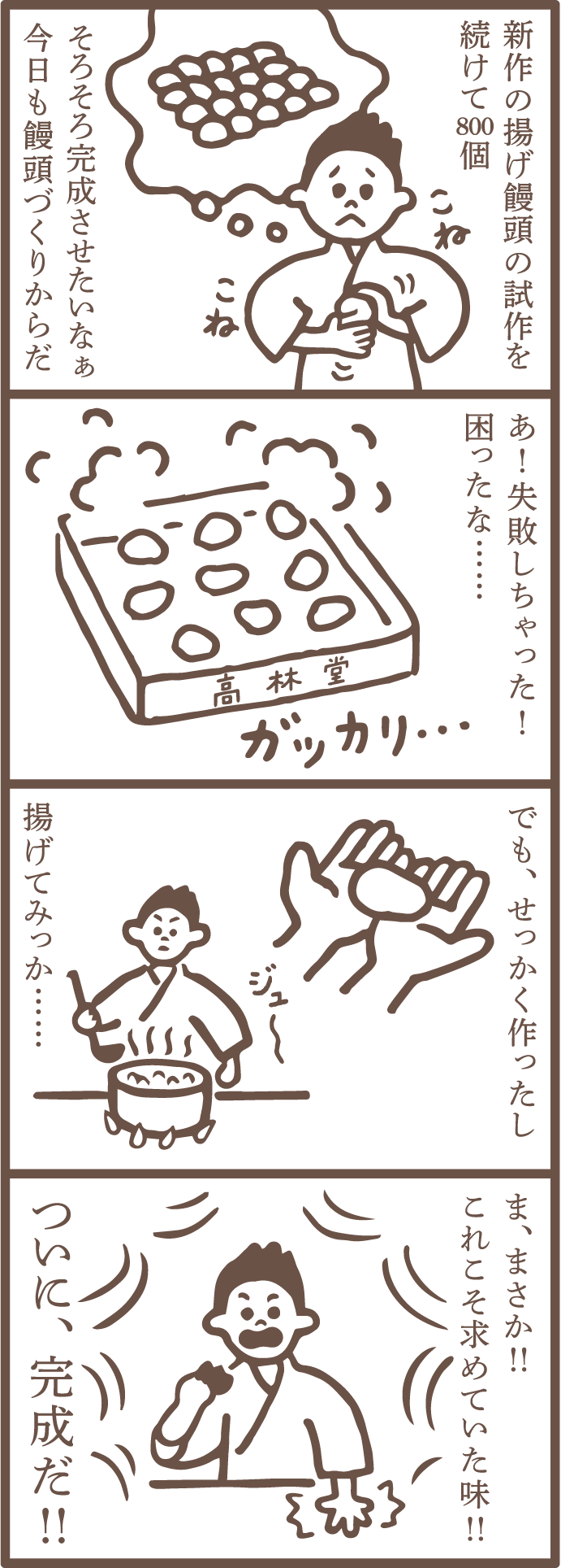 新作の揚げ饅頭づくりを続ける中で失敗するが、試しに揚げてみたことで「かりまん」が完成したエピソード。