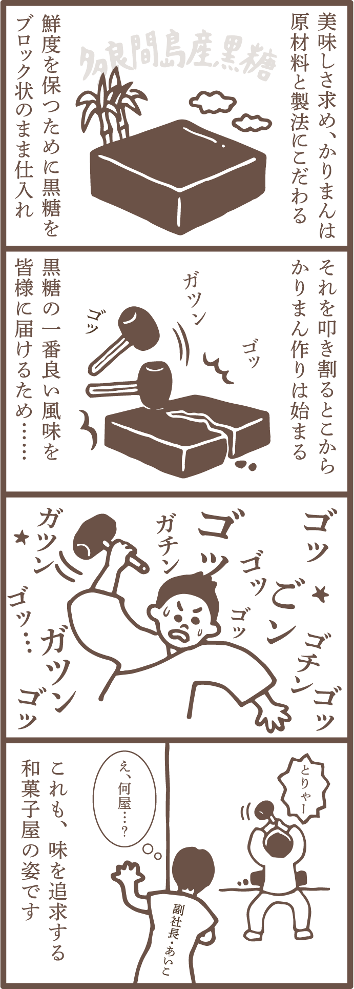 美味しさを追求するため、黒糖をブロックのまま仕入れて叩き割るなど、原材料と製法にこだわる様子を描いたエピソード。