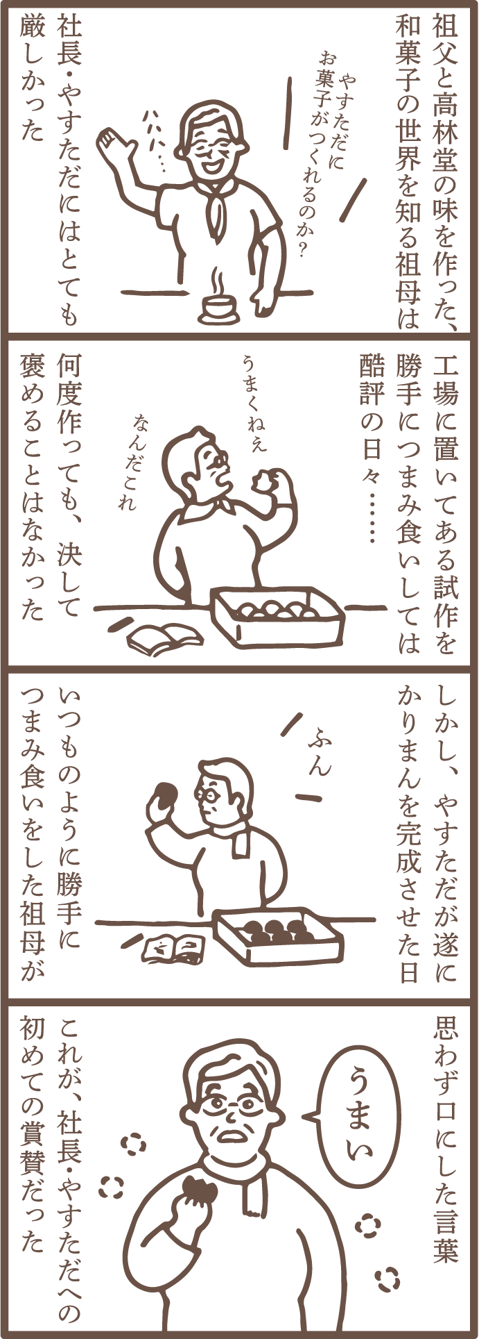 厳しい祖母のもとで試作を重ね、最後に「うまい」の一言を得て、社長やすただにとって初めての賛辞となったエピソード。