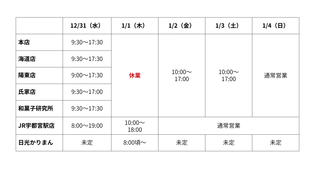 2025/11/21 2025-2026 年末年始の営業時間を以下の通り、変更させていただきます。 日光かりまんの営業日につきましては、詳細が決まり次第ご案内いたします。 皆様にはご不便をおかけしますが、何卒ご理解賜りますようお願い申し上げます。