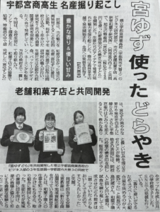 このたび、宇商 ビジネス研究部と高林堂のコラボ商品「宮ゆずどら」を12月3日付の毎日新聞にてご紹介いただきました。
