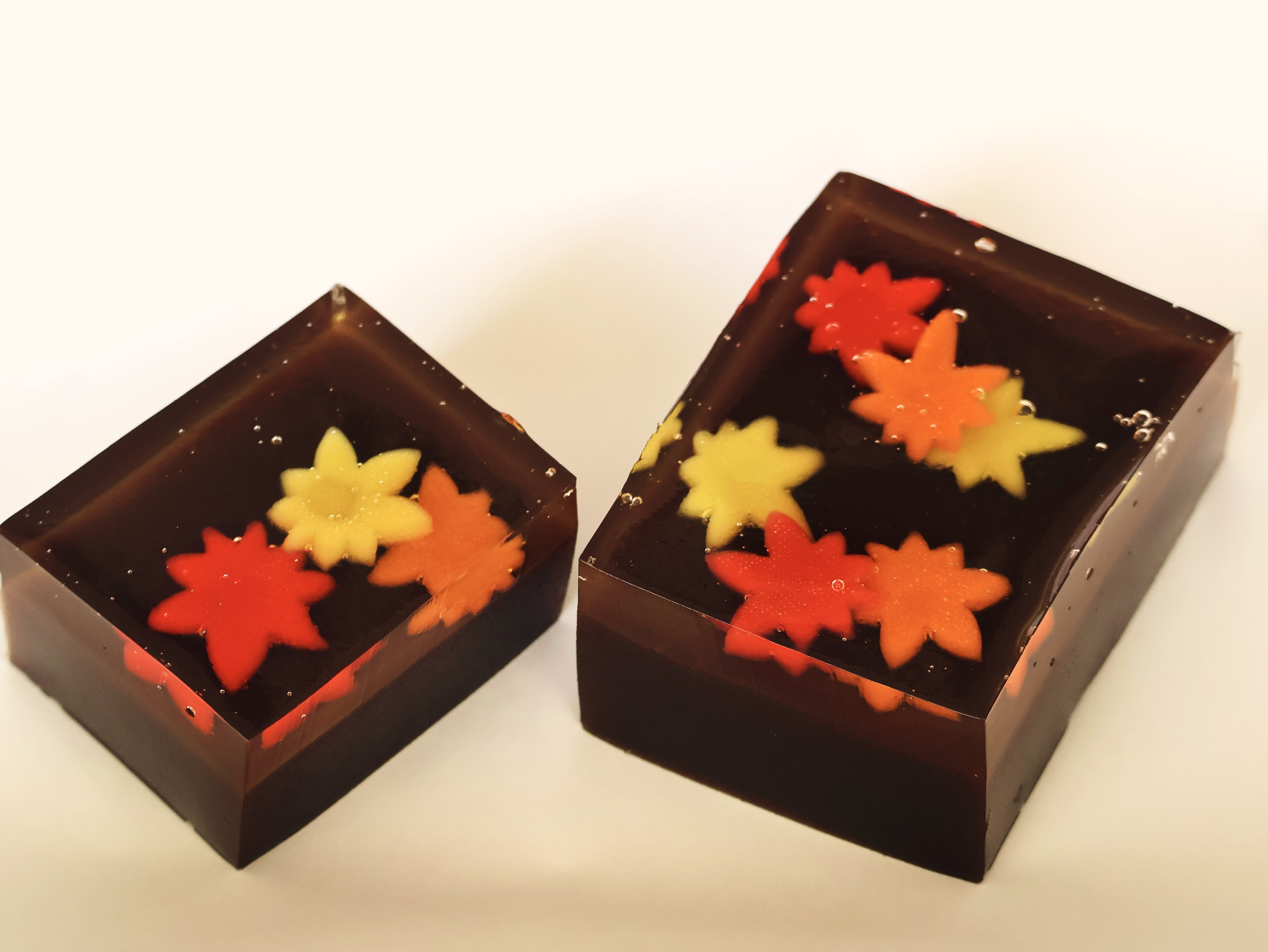 沖縄産黒糖の深いコクと優しい甘みが広がる羊羹に、透明感あふれる錦玉と紅葉の彩りが調和。